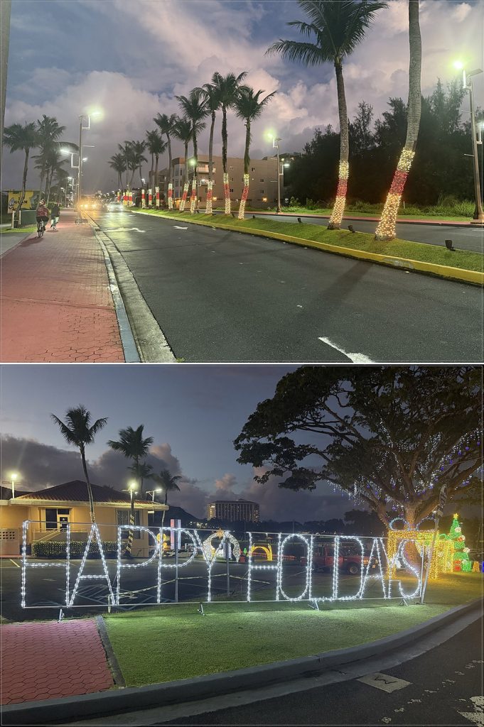 Near the park, the hotel road has lights on palm trees for the New Year season.