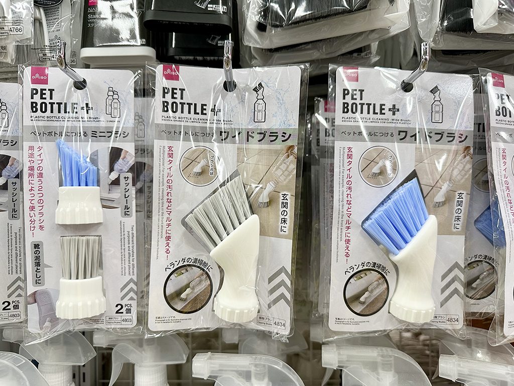 這是可以安裝在寶特瓶上的擦洗刷。可以放入水或清潔劑進行清洗,並且刷子的形狀有好幾種,可以根據不同用途來選擇。