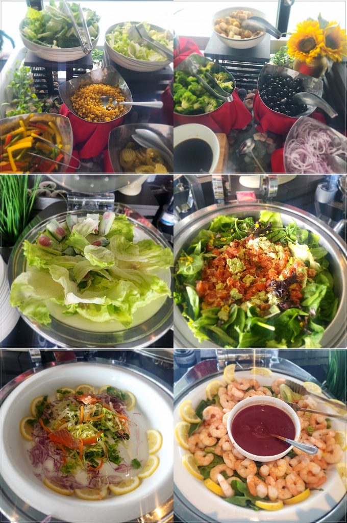 沙拉區提供新鮮的蔬菜、花椰菜、橄欖、洋蔥、玉米、鮪魚沙拉、煙燻鮭魚沙拉以及雞尾酒蝦。